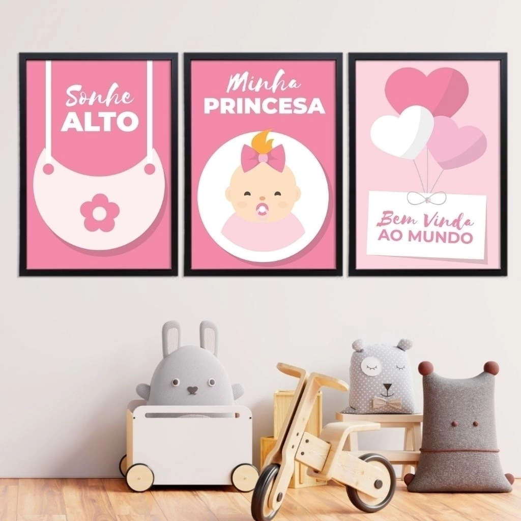 O kit 3 Quadros Sonhe Alto Minha Pequena Rosa é composto pela combinação dos seguintes quadros: